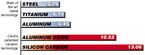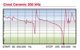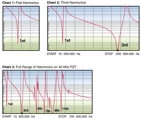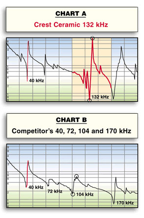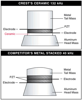 The superiority of chart A over chart B is clearly evident. High-tech ceramics make possible the direct stacking of high frequencies that before were only available as subharmonics of metal stacked frequencies (which derive their primary power from the weaker first harmonics). The stacking of a ceramic transducer to the exact frequency results in a significantly increased level of activity. Also snote that even with a third harmonic direct stacking, the Crest first harmonic (40 kHz) is stronger than the competitor's metal stacked 40 kHz. ADVANTAGES Ceramics Transmit Sound Better Acoustical Index ![]() The problem with traditional metal stacked transducers is that solid metal is actually made up of strands and strands of metal, which under high magnification is actually quite porous. In the transmission of sound waves, the porosity becomes very significant. High-tech ceramics like alumina oxide and silicon carbide have a composition of molecules so minute, the porosity is near zero. Their surfaces are so flat they can be measured in 1,000,000 of an inch. As a result they offer superior acoustical speed and an improved surface interface. Thus stacking an ultrasonic transducer with ceramics greatly enhances the transmission of ultrasonic energy. The near perfect transmission of sound also reduces the amount of stress involved with transmitting ultrasonic energy, resulting in increased day-to-day reliability and a much longer trouble-free life for the system in use. Stacking Transducers With Ceramics The ceramic interface allows for the near-perfect transmission of sound. THIRD HARMONIC FREQUENCIES... THE BIGGEST ADVANTAGE What is a third harmonic frequency? ![]() The first harmonic is 40 kHz (Chart 1). But when you expand the chart, notice the stronger third harmonic (Chart 2). If you do a complete scan of the 40 kHz PZT you can see a total of six (6) strong harmonics, with 40 kHz (the first harmonic) being the weakest. The advantage of being able to directly stack harmonics other than the first gives the user of ceramic stacked transducers a big advantage. Metal stacking works off the weakest harmonics. CONCLUDING STATEMENTS How Many Third Harmonic Possibilities Are There For High Frequencies? Is it possible to create a third harmonic frequency at any point between 100 and 350 kHz? Yes, you can create third harmonics up to 500 kHz but it would be cost prohibitive for the end user, as you go above the 325 to 350 kHz range. Is The Ceramic 132 kHz The Universal Transducer Of The Future? The Ceramic 200 kHz
